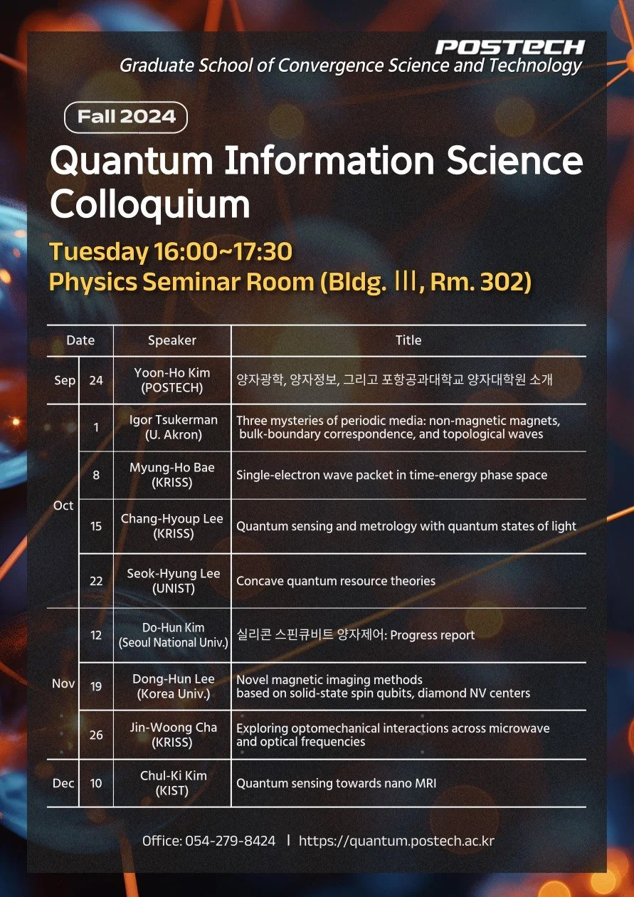 [콜로퀴움] 2024년 2학기 일정 Sep 17 Written By Tae Kim Fall 2024Quantum Information Science ColloquiumTuesday 16:00-17:30 Zoom linkPhysics Seminar Room (Bldg. III, Rm. 302) Tae Kim