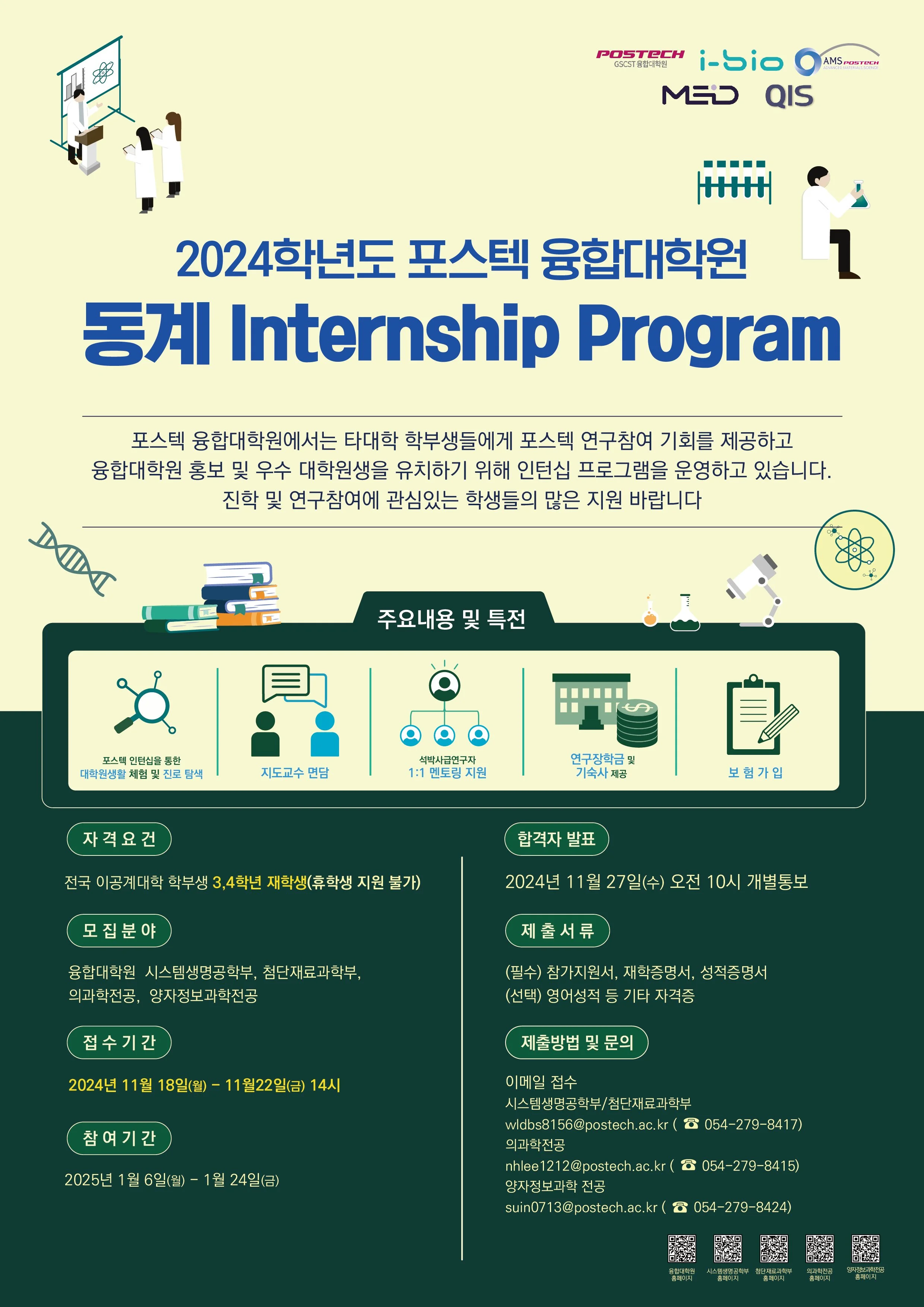 ② 모집인원/대상: 6명 이내, 전국 이공계대학 학부생 3, 4학년 (포스텍 학부 재학생 지원 가능)